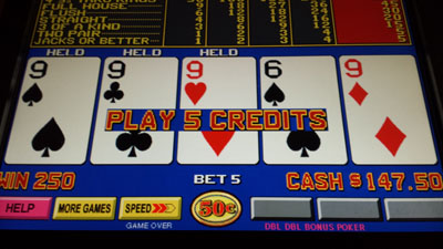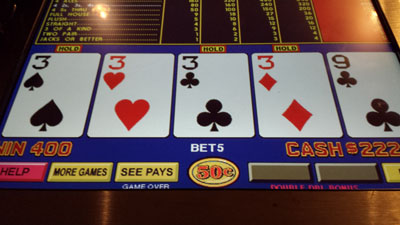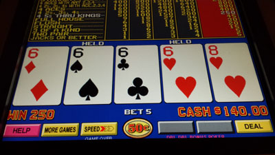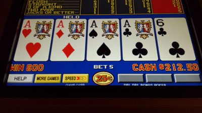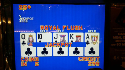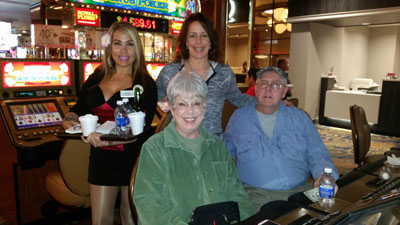 So excited to start our adventure, but FIRST, we wanted to give our wonderful hostess, Carrie, a little giftie. On this LV trip, we were joined by our nieces, Lisa (TX) and Anne (MO), and my brother, Roger and his wife, Jane (AZ). Many pics to follow!!! All of us actually spent some time out of the casino, taking time to visit Red Rock Canyon and Red Rock Casino, thanks to Roger's chauffering skills! Had to get out of the car and watch some crazy rock climbers. Serious stuff. After the Canyon, we took some time to explore the Casino. We had never been there. Quite awesome. I shared a wonderful outdoor lunch with Roger and Jane, while Bob and Lisa caught a snack then hit the machines hard. A little friend we found (behind glass, thank goodness) at the Red Rock Canyon Visitor Center/Gift Shop. Look who I found outside the visitor center!! A wonderful dinner at the new Noodle House at The California! Our very own special room in the back - so we could get crazy and noisy, neither of which we did. Roger draining the brain of Bob Kinnard, Assistant Slot Manager for the Boyd properties downtown. So glad Bob could could join us, if just for a drink. What a generous and nice guy!! Yes . . . we ARE always eating. That is always the most social part of our trips. Enjoying Breakfast at The Cal with Roger, Jane and Lisa. Gearing up for our road trip to Mt. Charleston. One of the ski lodges on Mt. Charleston. Enjoying our time at a real family-style ski lodge. Roger and Annie Fooling around in Roger and Jane's room, while taking our annual California denim shirt pictures. Outside the ski lodge after lunch. Annie thinking, "Where in the heck is my drink!!" Other pictures around the casino . . . No, no, no, I was NOT drinking that beer, I stole it from Annie for the pic. My fave drink this trip was cranberry juice / vodka!! Lisa with our favorite person . . . Bob Kinnard. One of our favorite waitpersons, Maria, at The California. She has been there for as long as we've been staying there. She never changes!! Annie and Auntie getting ready for some serious gambling. Another one of our favorite waitpersons, LauraLynn. So sweet and always there with our drinks! Bob and I at our favorite machines. Ready, set, go!! Yet another of our great waitpersons, another Maria at The Fremont. Sweet and loving is she and always glad to see us. Bob Kinnard was able to join us for a drink before our awesome dinner at the Redwood Grill. Thanks to his generosity (i.e. a comp), we were able to eat and drink whatever we wanted. And . . . we pretty much did. Redwood Grill - great atmosphere and the best waitpersons! Uncle Bob does love his nieces! Annie, almost overcome, by the little surprise belated birthday party we had for her accompanied by a card, a little birthday $$ and a sweet birthday dessert brought to our table later. Thank you, Lisa, for arranging!! SHE did it; NO, HE did it - WHAT??? A little side trip down to the end of Fremont Street to the El Cortez. A couple of showgirls trying to get themselves and their costumes on a bar chair. Weird, huh? We have so many waitpersons who are special to us and take excellent care of our liquid needs. Sarah is one of them!! Our annual "California denim shirt" picture. We treasure these shirts since The Cal apparently stopped selling them. Love this tradition. Our beautiful nieces. So great having them join us yet again in Las Vegas. Bob and Maria at the Fremont. Lisa arriving at The Cal and ready to rumble. Annie ready to rumble as well!! Lisa with Nancy, who works at the main cage. Uh oh . . . Lisa and Annie putting their heads together before our arrival!! Now we know why it's called Red Rock Canyon - look at that sky! A license plate I thought was quite catchy. Don't know how we rated a limo ride back to the airport, but our thanks to Bob Kinnard for his generosity and thoughtfulness! Lisa - not quite ready to jump into the limo! Well, it looks like Lisa didn't find it hard to settle in - neither did we. There's something about a limo ride to the airport that makes the end of our trip not quite so sad!! We WILL meet again in September. Here are some screenshots of Sharon's video poker wins, some fifty cent machine and some dollar machine wins were most appreciated! We all know how difficult it is to complete a straight flush. This one is unusual because 1) Bob held only a Jack, and 2) he ended up with a Sequential Straight Flush. He can only remember ever ending up with a SSF once before. Pardon the photo, but Bob wanted to include this photo not because it's a straight flush but the point tracker (which increments as you play with your player's card in the machine) just happened to read "711" ... Bob played a game called Ultra Bonus Aces practically every day and finally on the last morning he got a set of Aces for $500. And Bob played Super Aces Bonus every day without success until 12 minutes before we left for the airport and got lucky with a set of 50c Aces for a grand. Lisa scored a nice Royal Flush on her first night of the trip. Bob's only DDB Aces kicker of the entire trip...
