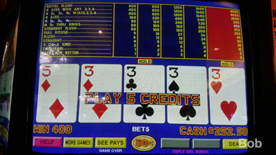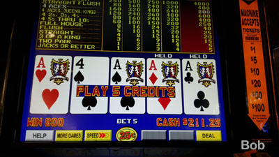 Ultra Bonus (found only at the Cal as far as we know) offers 800 coins for 2-4s (no kickers) and 2000 coins for Aces.
