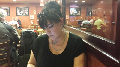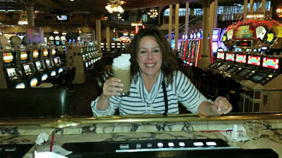 Lisa enjoying her morning coffee (?), and some alone time, at the Main Street Station bar.