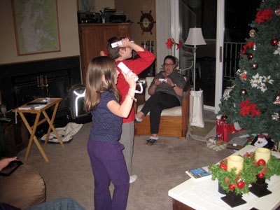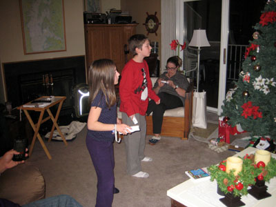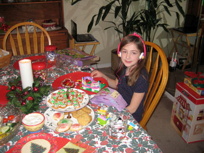 Bob's daughter, Chris, her husband, Roger and our 3 grandchildren joined us on Christmas. This is Em having a quiet moment with her earphones and surrounded by goodies (note Shar's new popcorn maker on the floor behind her from Karen and Bobby). |