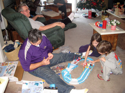 Roger trying to help Zachary put toy together. Bob watching over the proceedings! |