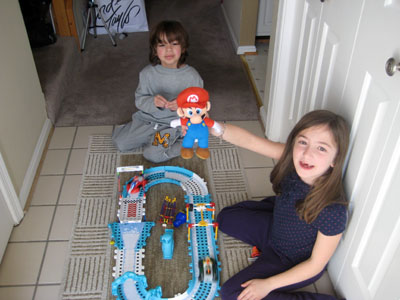 Em and Zachary playing with Zack's Mario track.